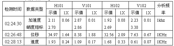 注:測點H101為電機負荷端軸承水平方向,V101為電機負荷端軸承垂直方向;H102為電機非負荷端軸承水平方向,V102為電機非負荷端軸承垂直方向,振動速度單位為mm/s,振動加速度單位為m/s2